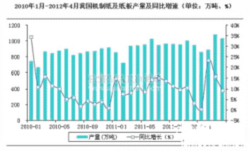 前瞻网2012-5-31报道: 2012年4月份,全国机制纸及纸板产量1029.3万吨,较去年同比增长9.31%;1-4月,机制纸及纸板累计产量3805.6万吨,同比增长9.6%。
