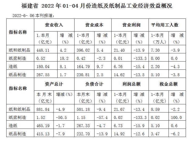 福建省 2022年01-04月份造纸及纸制品工业经济效益概况