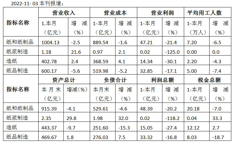 福建省 2022年01-09月份造纸及纸制品工业经济效益概况