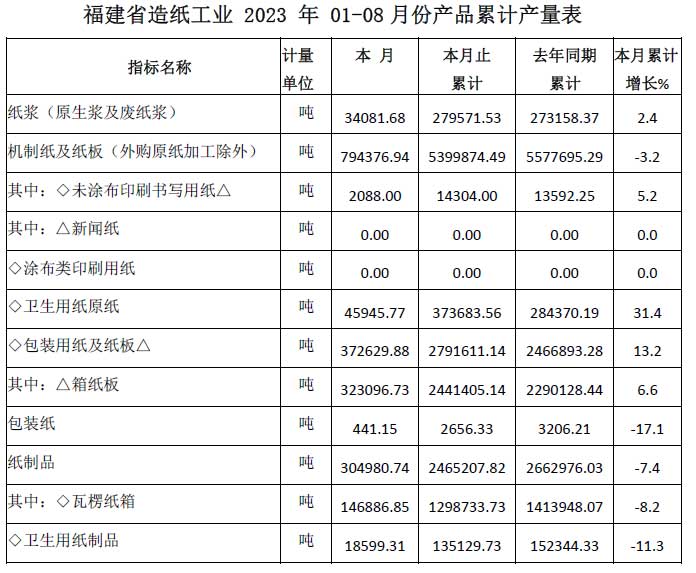 福建省造纸工业-2023-年-01-08月份产品累计产量表