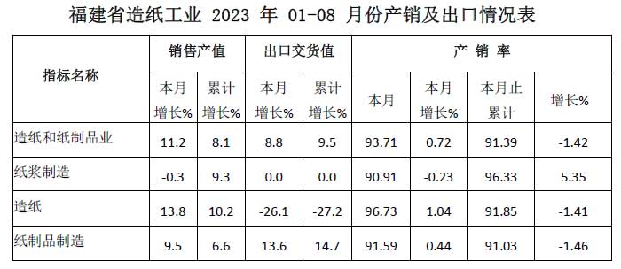 福建省造纸工业-2023-年-01-08-月份产销及出口情况表