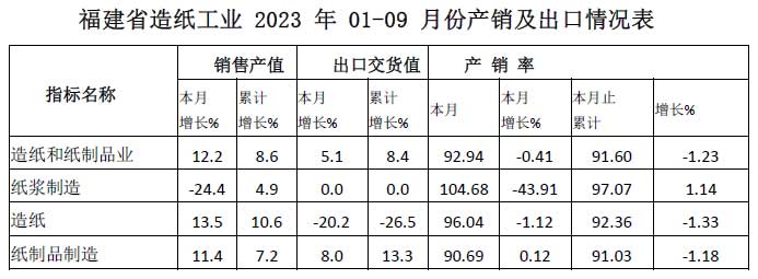 福建省造纸工业-2023-年-01-09-月份产销及出口情况表